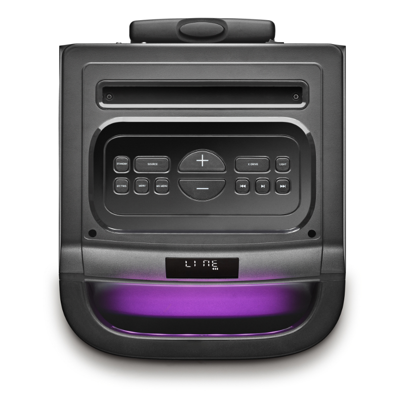 Tamaño compacto y portátil (incluye ruedas y trolley), proporciona sonido de alta calidad gracias a su gran potencia de salida, 180W RMS.