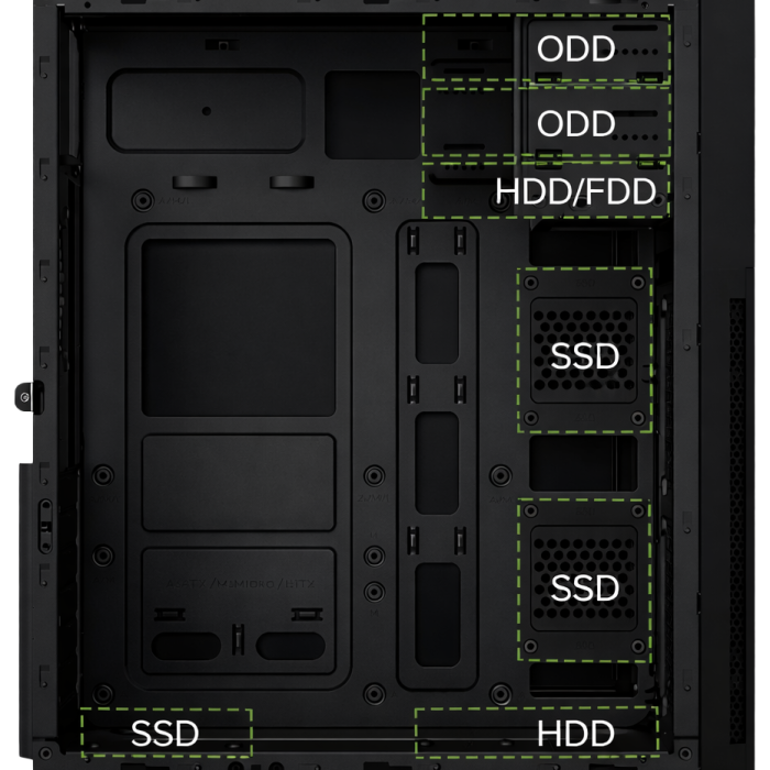 ATX / Cooler CPU 140 mm / 3×SSD + 1×HDD / USB-C + USB 3.0 + USB 2.0 / Fuente 500W 80+