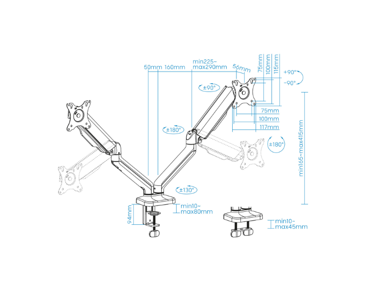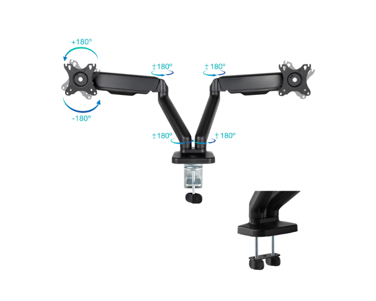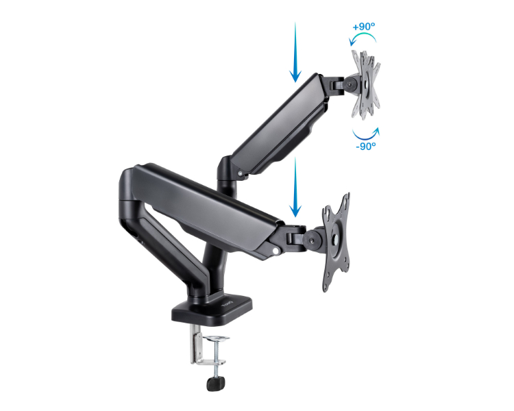 De 17 a 32"/ VESA máximo 100x100mm/ Hasta 9kg/ Ángulo de giro de 90º/ Ángulo de rotación de 180º/ Altura ajustable hasta 415mm